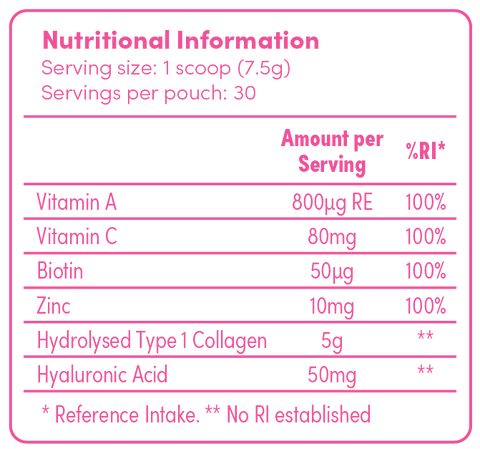 Hydrolysed Fish Collagen, Maltodextrin, Natural Flavours, Acid (Citric Acid), Vitamin C (Ascorbic Acid), Hyaluronic Acid, Zinc Citrate Trihydrate, Sweetener (sucralose), Vitamin A (Retinol Acetate), Biotin.