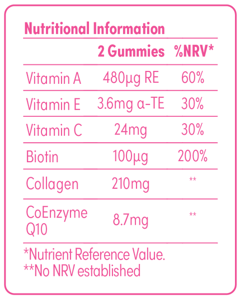 Glucose Syrup, Sugar, Water, Collagen (Bovine), Gelling Agent (Pectin), Acid (Citric Acid), Vitamin C (Ascorbic Acid), Maltodextrin, Acidity Regulator (Trisodium Citrate), Colour (Anthocyanins), Vegetable Oil (Coconut), Vitamin E (DL-Alpha Tocopheryl Acetate), CoEnzyme Q10, Flavouring, Vitamin A (Retinyl Acetate), Glazing Agent (Carnauba Wax), D-Biotin.